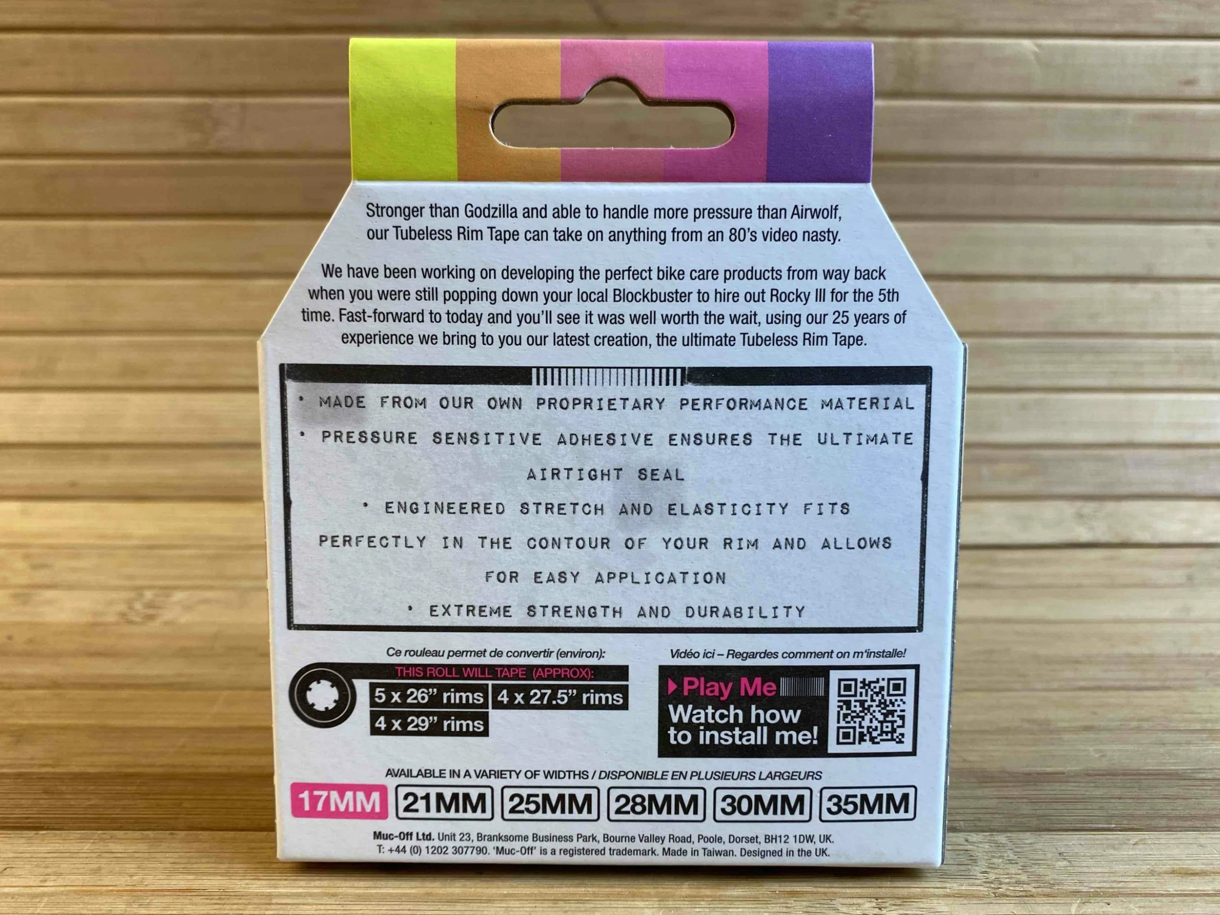Das Muc-Off Felgenband bietet sowohl die richtige Dehnung als auch Haltbarkeit und Festigkeit, die für eine dauerhafte luftdichte Versiegelung nötig sind. Durch das semitransparente Material kann die Ventilbohrung leicht gefunden werden.