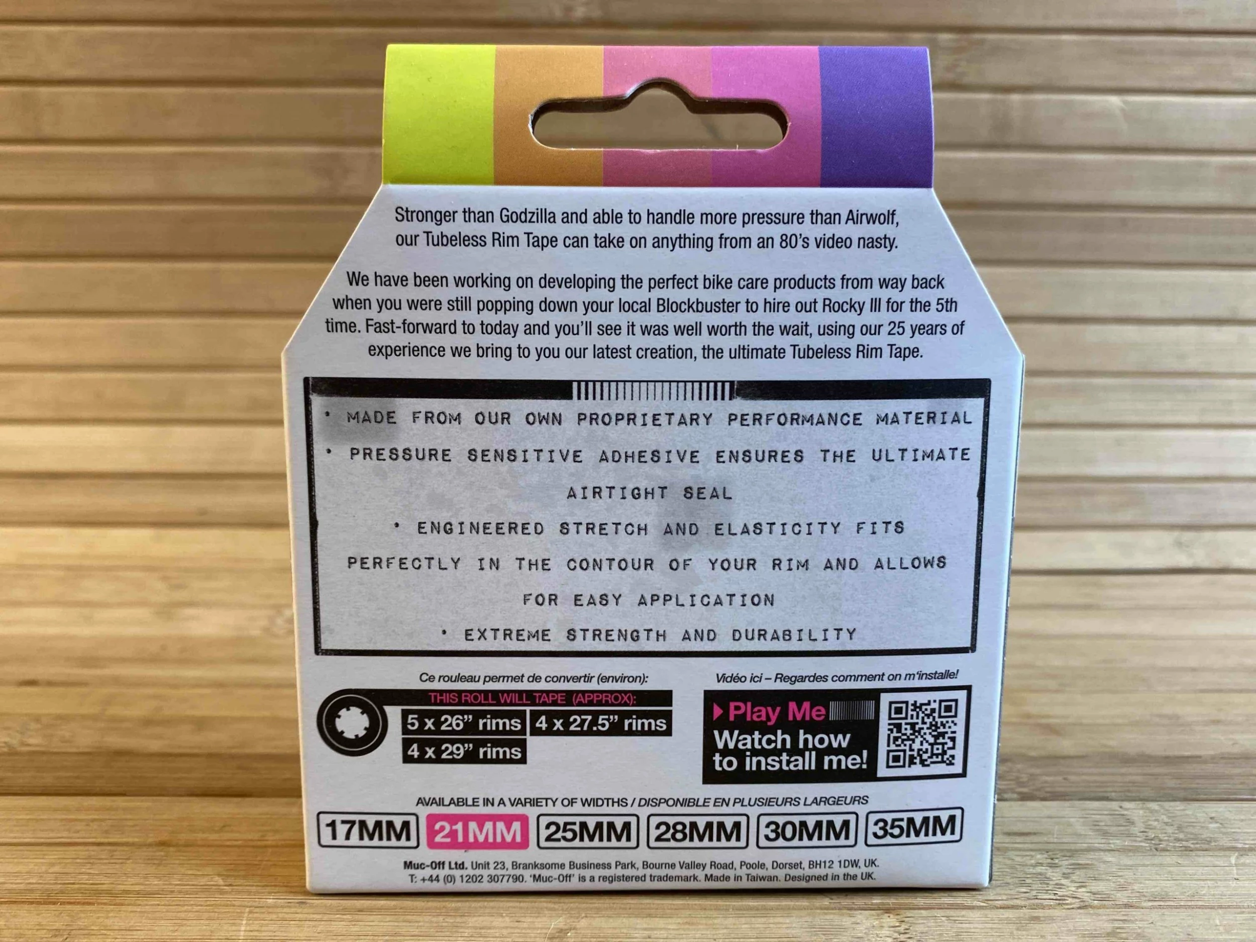 Das Muc-Off Felgenband bietet sowohl die richtige Dehnung als auch Haltbarkeit und Festigkeit, die für eine dauerhafte luftdichte Versiegelung nötig sind. Durch das semitransparente Material kann die Ventilbohrung leicht gefunden werden.
