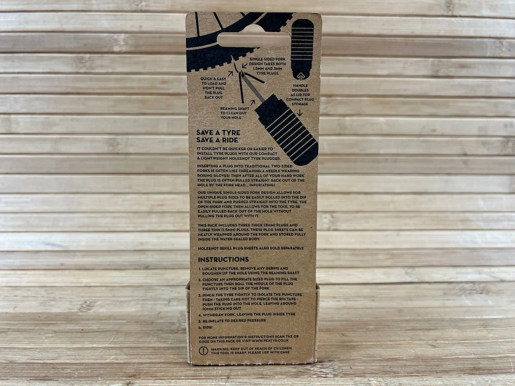 Einfach den Deckel abschrauben und auf die Rückseite des Tools stecken, um einen stabilen Griff zu erhalten, während man den Plug einführt. Dieses Set enthält drei dicke (3 mm) und drei dünne (1,5 mm) Plugs. Die Plugs lassen sich sauber um die Spitze wickeln und in dem kompakten, wasserdichten Gehäuse verstauen. Holeshot Nachfüllstopfen sind außerdem separat erhältlich, verpackt im Karton-Header-Karten und biologisch abbaubaren Verpackungen.